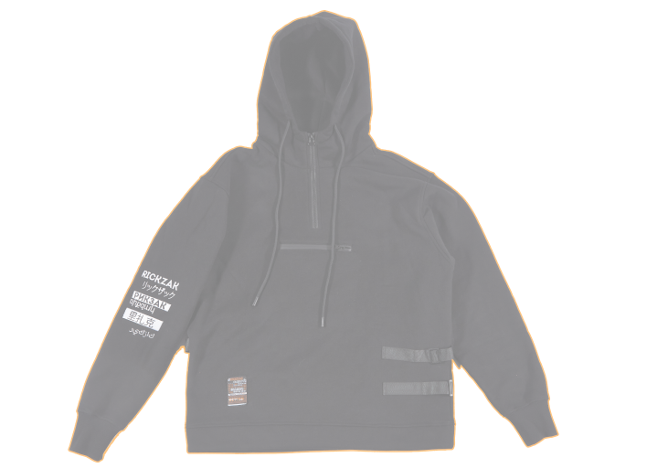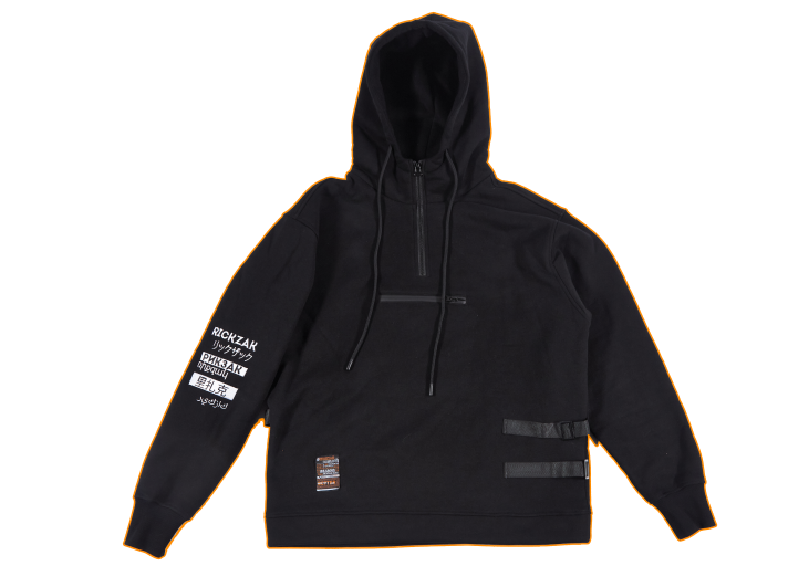 Оригинальное и притягательное черное худи свободного кроя с обилием разнообразных стильных акцентов. Высокий ворот с молнией заканчивается круглым капюшоном на шнурках. Потайной карман на молнии на груди, ленты с фиксаторами по бокам: слева спереди, справа на спине